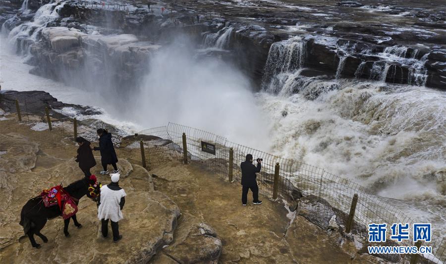 12月14日,游人在壺口瀑布景區(qū)游玩(無人機(jī)拍攝)。新華社記者陶明攝
