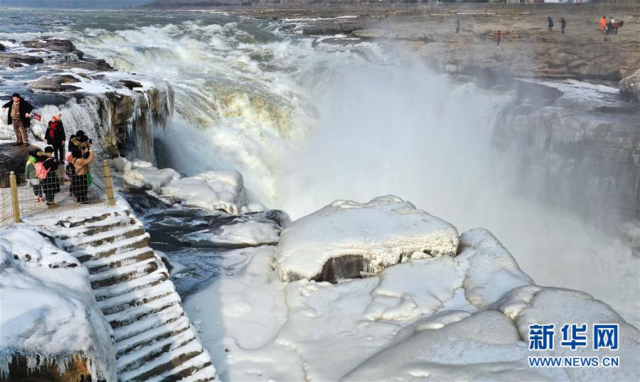 1月12日,游人在陜西黃河壺口瀑布景區(qū)游覽(無人機(jī)照片)。新華社記者陶明攝
