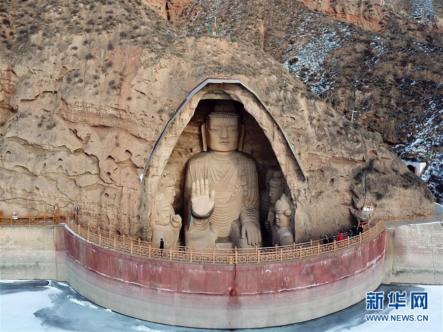 1月11日,游客在參觀天梯山石窟13號窟(無人機照片)。新華社記者馬寧攝