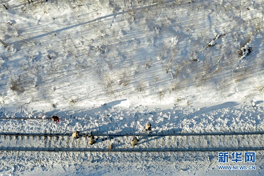 1月8日,西羅奇維修工隊(duì)工作人員在嫩林線501公里處進(jìn)行線路維修作業(yè)(無(wú)人機(jī)照片)。新華社記者王毓國(guó)攝