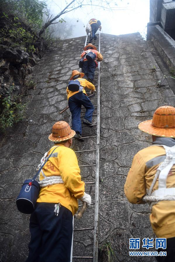 1月14日,百色工務(wù)段白水河橋隧工區(qū)班組成員攀梯上山開展巡查工作。在中國(guó)鐵路南寧局集團(tuán)公司百色工務(wù)段白水河橋隧工區(qū),有一個(gè)由14名工人組成的班組。他們常年像“爬山虎”一樣行走攀爬在地形險(xiǎn)峻、云霧繚繞的高山上,負(fù)責(zé)南昆鐵路轄區(qū)路段的搜山掃石工作,清除一切可能危害鐵路行車安全的因素,保障旅客出行安全。新華社記者張愛(ài)林?jǐn)z