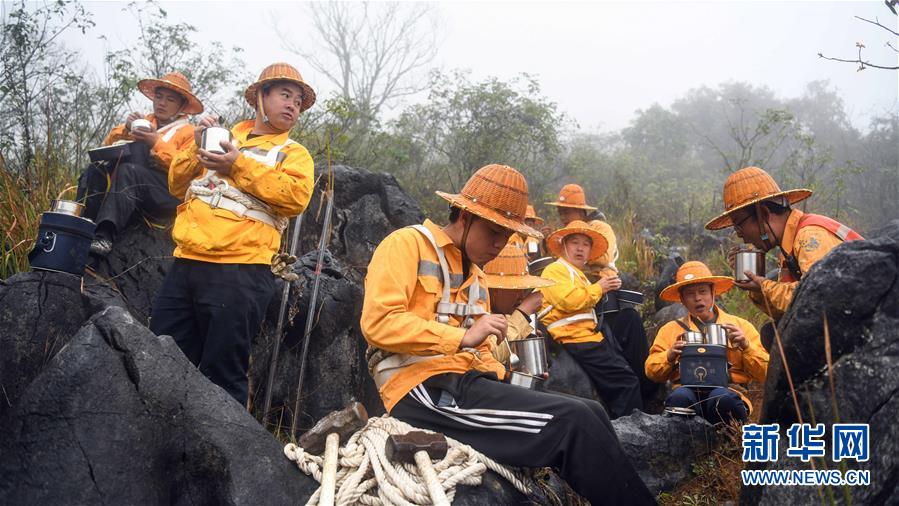 1月14日,百色工務(wù)段白水河橋隧工區(qū)班組成員在工作間隙吃午飯。在中國(guó)鐵路南寧局集團(tuán)公司百色工務(wù)段白水河橋隧工區(qū),有一個(gè)由14名工人組成的班組。他們常年像“爬山虎”一樣行走攀爬在地形險(xiǎn)峻、云霧繚繞的高山上,負(fù)責(zé)南昆鐵路轄區(qū)路段的搜山掃石工作,清除一切可能危害鐵路行車安全的因素,保障旅客出行安全。新華社記者張愛林?jǐn)z