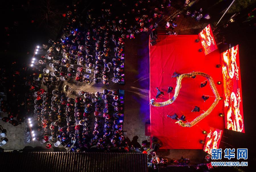 1月14日,杭州市余杭區(qū)中泰街道中橋村的文化公園內(nèi)在進(jìn)行“我們的村晚”舞龍表演,吸引了大批當(dāng)?shù)匕傩沼^看(無(wú)人機(jī)照片)。臨近春節(jié),浙江省杭州市余杭區(qū)中泰街道各村社的文化禮堂紛紛上演“我們的村晚”。老百姓自編、自導(dǎo)、自演為主的“土味”聯(lián)歡會(huì)因接地氣、親情濃而深受當(dāng)?shù)匕傩盏南矏?ài),成為當(dāng)?shù)剜l(xiāng)村百姓的新年迎春“文化大餐”。近年來(lái),中泰街道以文化振興助推鄉(xiāng)村振興。目前,中泰街道下屬各村陸續(xù)建成文化禮堂7個(gè)、社區(qū)文化家園2個(gè),努力培育和挖掘出一批鄉(xiāng)土文化人才及原創(chuàng)作品,2019年全年開(kāi)展各類(lèi)鄉(xiāng)村社區(qū)惠民文體活動(dòng)累計(jì)180余場(chǎng)次。新華社記者徐昱攝