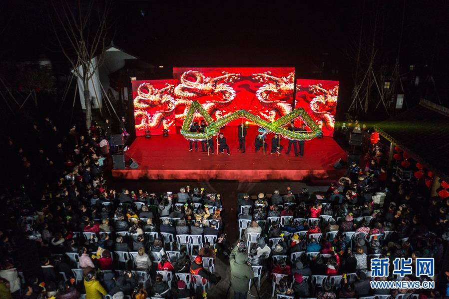 1月14日,杭州市余杭區(qū)中泰街道中橋村的文化公園內(nèi)在進行“我們的村晚”舞龍表演,吸引了大批當?shù)匕傩沼^看(無人機照片)。臨近春節(jié),浙江省杭州市余杭區(qū)中泰街道各村社的文化禮堂紛紛上演“我們的村晚”。老百姓自編、自導、自演為主的“土味”聯(lián)歡會因接地氣、親情濃而深受當?shù)匕傩盏南矏?,成為當?shù)剜l(xiāng)村百姓的新年迎春“文化大餐”。近年來,中泰街道以文化振興助推鄉(xiāng)村振興。目前,中泰街道下屬各村陸續(xù)建成文化禮堂7個、社區(qū)文化家園2個,努力培育和挖掘出一批鄉(xiāng)土文化人才及原創(chuàng)作品,2019年全年開展各類鄉(xiāng)村社區(qū)惠民文體活動累計180余場次。新華社記者徐昱攝