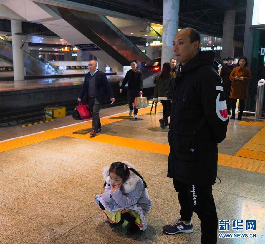 1月3日晚,朱梓芮(左一)在父親朱晨的陪同下前往南昌西站站臺準備與母親團聚。新華社記者 胡晨歡 攝