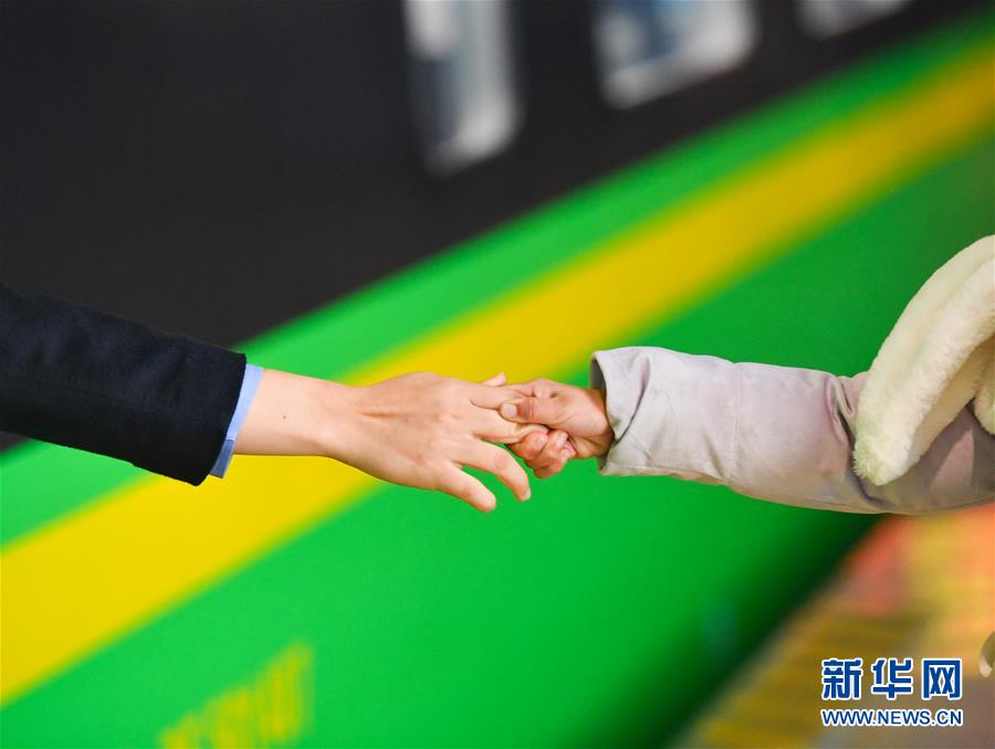 1月3日,朱梓芮在站臺上將母親手腕上稍有模糊的“手表”描繪清晰。新華社記者 胡晨歡 攝