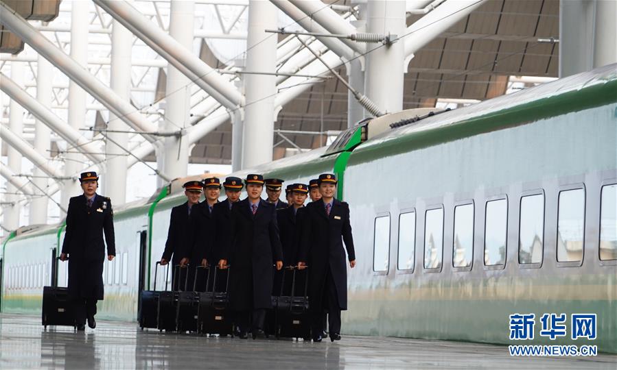 1月11日,在西安北站,列車長陳海燕在站臺上目送旅客下車。新華社記者 詹彥 攝