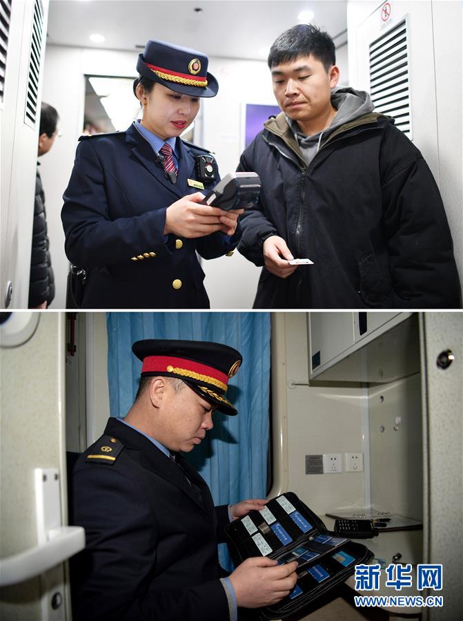 拼版照片上圖:在太原南開往西安北的D2507次列車上,列車長陳海燕(左)幫助乘客辦理補票業(yè)務(新華社記者詹彥1月11日攝);下圖:在陽泉北站,列車長趙耀在查看臥鋪車票(新華社記者楊晨光1月11日攝)。新華社發(fā)