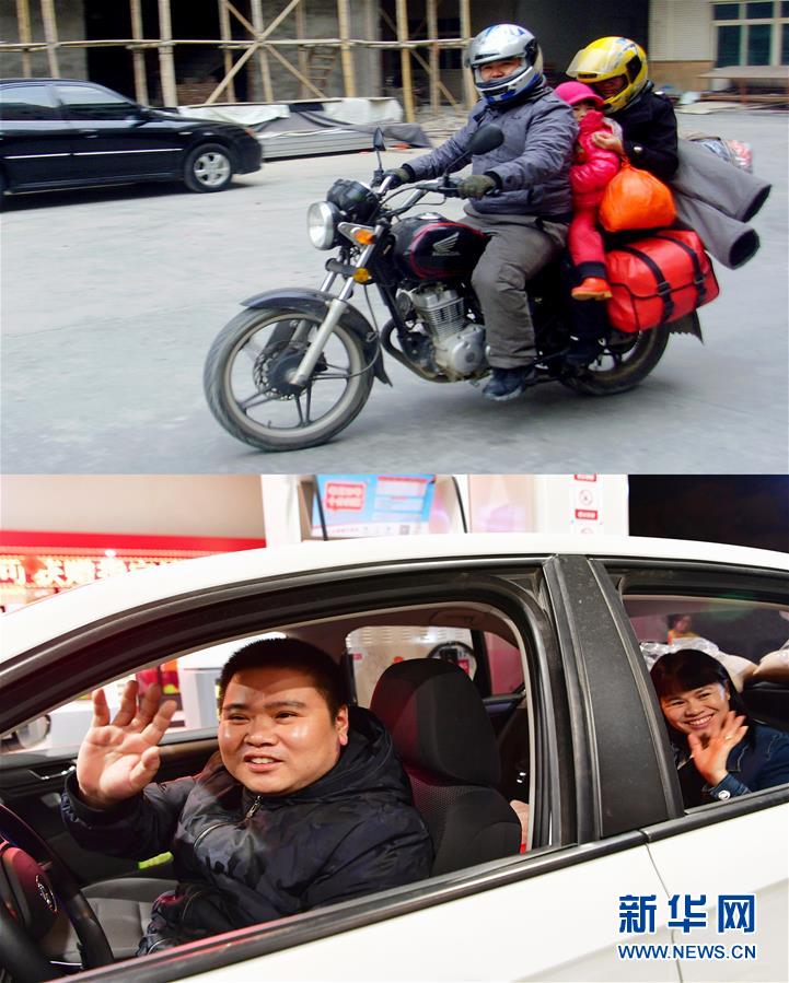 拼版照片:上圖是董日旭帶著家人騎摩托車(chē)返鄉(xiāng)過(guò)年(資料照片,2013年2月2日攝),下圖是董日旭開(kāi)著他新買(mǎi)的汽車(chē),帶家人來(lái)到中國(guó)石油泉州博覽大道加油站領(lǐng)加油卡(1月15日新華社記者魏培全攝)。