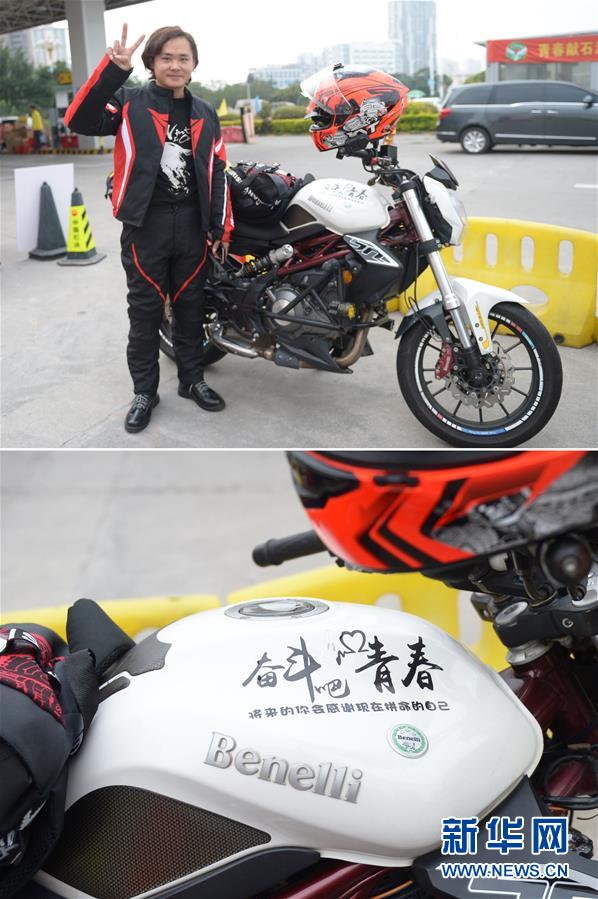 拼版照片:上圖是冉曉紅在中國石油漳州龍江路站留影,下圖是冉曉紅摩托車上的標語(1月15日攝)。20歲的冉曉紅是重慶人,在福建廈門從事餐飲業(yè),2019年買了一輛高檔摩托車,2020年與朋友結伴騎摩托車返鄉(xiāng),路上預計需要五天時間。 新華社記者 賀燦鈴 攝