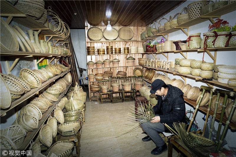 2019年1月26日,重慶中山古鎮(zhèn),880桌“千米長(zhǎng)宴”5萬人共品年味。古鎮(zhèn)居民們編制的竹編制品。
