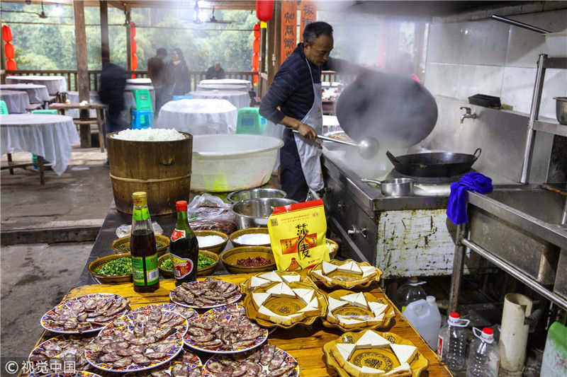 2019年1月26日,重慶中山古鎮(zhèn),880桌“千米長(zhǎng)宴”5萬(wàn)人共品年味。街坊們?cè)陬^天就開始準(zhǔn)備各種菜肴與小吃。