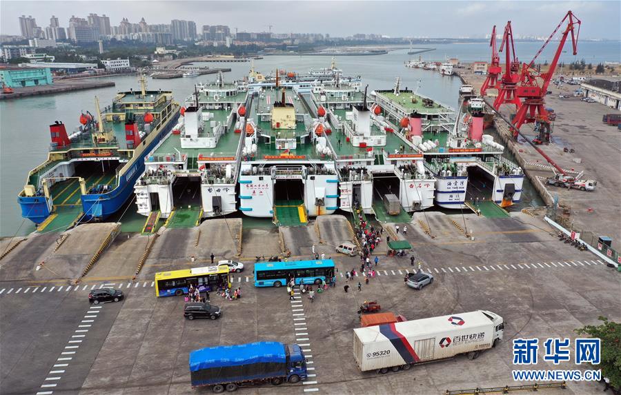 1月19日,車輛在海口秀英港輪渡碼頭登船。 新華社記者 郭程 攝