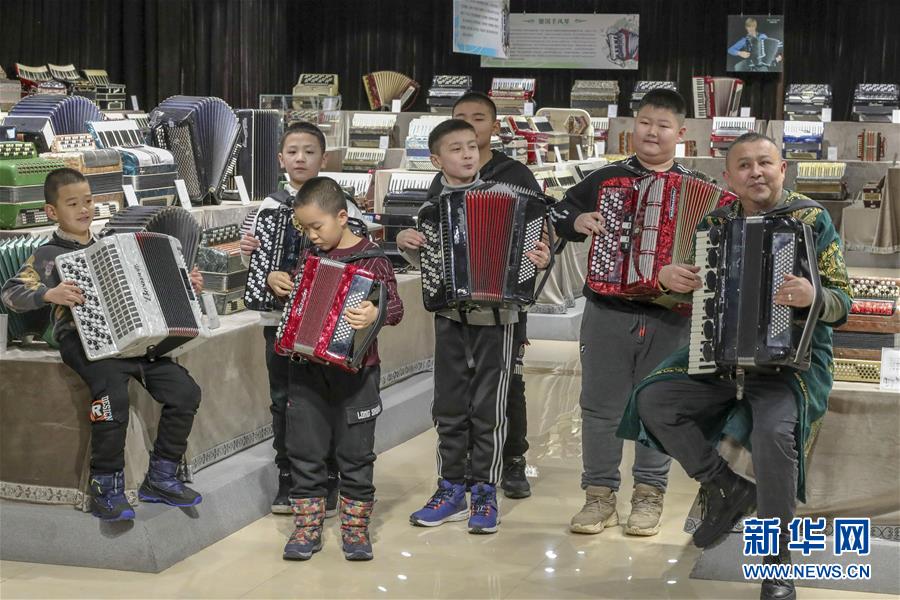 在塔城市手風(fēng)琴博物館,當(dāng)?shù)匚乃噽?ài)好者為游客演奏手風(fēng)琴(1月21日攝)。新華社記者 趙戈 攝