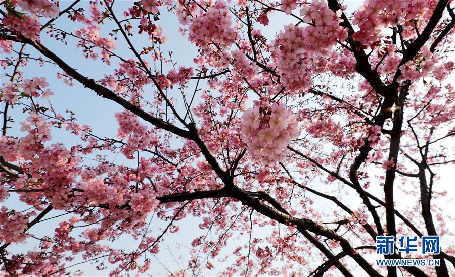2月24日,蜜蜂在上海松江辰山植物園內盛開的河津櫻櫻花叢中飛舞。近日,上海松江區(qū)辰山植物園內的河津櫻絢麗綻放,花團錦簇間一派盎然春意。 新華社記者 方喆 攝
