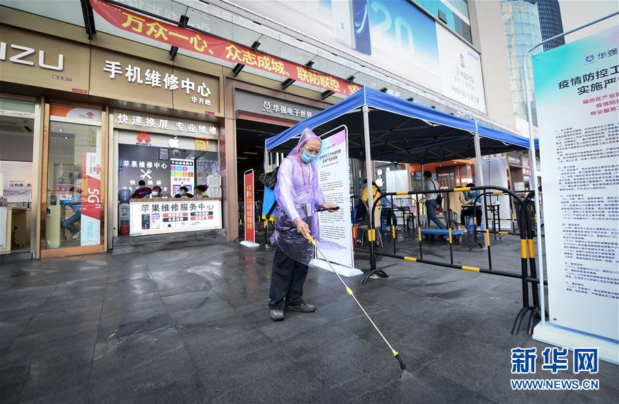 2月24日,在深圳華強北的華強電子世界外,工作人員進行消殺作業(yè)。 深圳福田區(qū)的華強北商圈是重要的電子元器件交易集散地。商圈的商戶原本在市場里密集的“一米柜臺”工作,空間相對封閉。受疫情影響,目前市場暫未完全開放。為助力商戶復工復產(chǎn),商圈幫助商戶將交易轉移到室外,小批次允許商戶進入柜臺取貨,同時在室外的步行街搭建了約100頂帳篷,供商戶和客戶使用。 新華社記者 毛思倩 攝