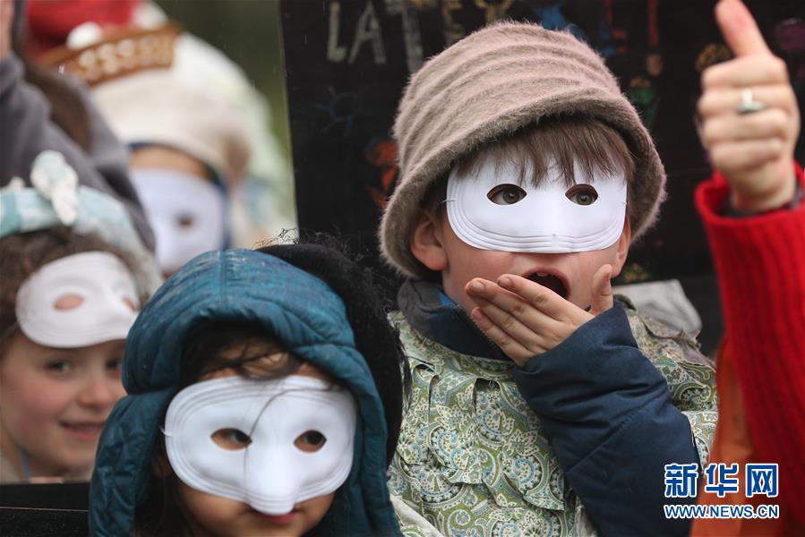 2月27日,兒童在比利時布魯塞爾參加狂歡節(jié)活動。 新華社記者鄭煥松攝
