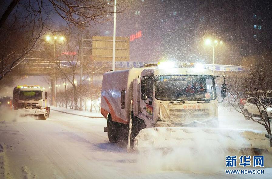 2月28日,清雪車輛在哈爾濱市的一條馬路上作業(yè)。新華社記者 王松 攝
