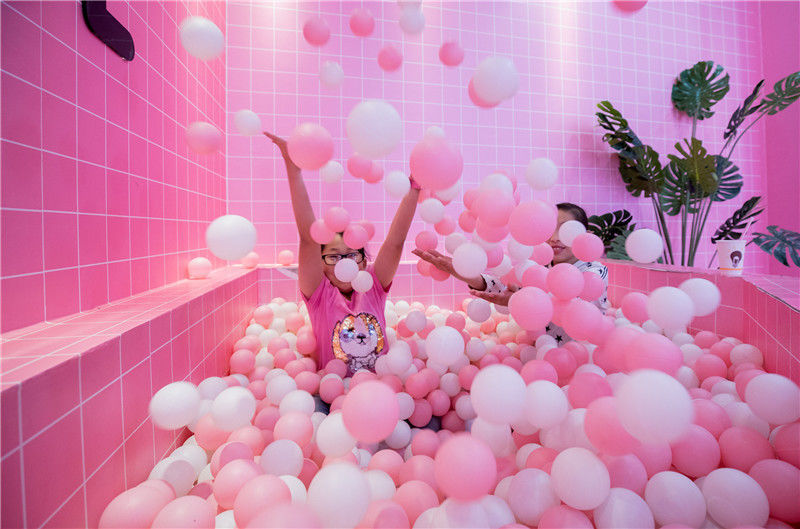 2018年9月20日,呼和浩特玉泉區(qū),市民在夢幻love粉色小屋內(nèi)留影游玩。丁根厚/視覺中國
