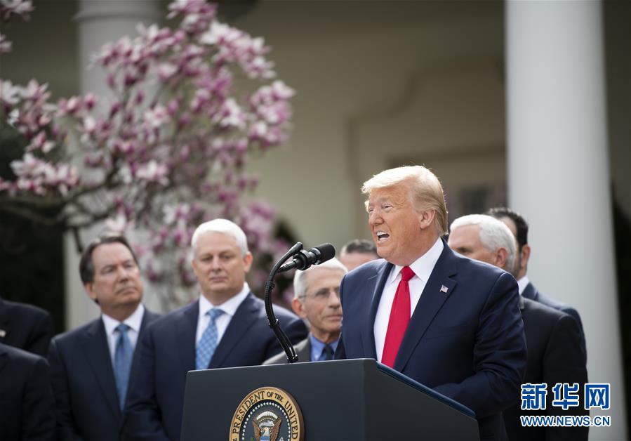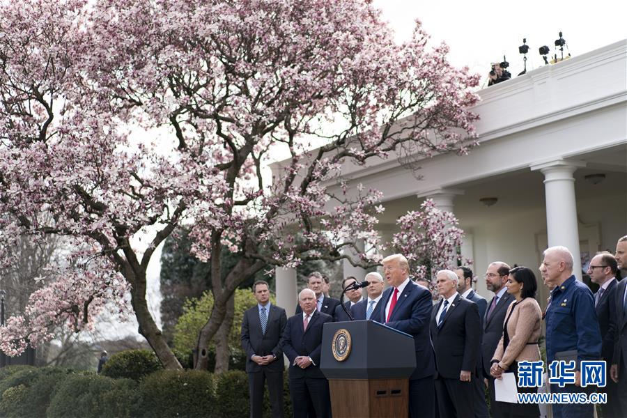 3月13日,美國總統(tǒng)特朗普(前)在華盛頓白宮的記者會上講話。特朗普當天下午在白宮發(fā)表講話時正式宣布“國家緊急狀態(tài)”。他說,此舉旨在讓美國聯(lián)邦政府全力投入到抗擊新冠肺炎疫情的努力中。這項舉措將釋放500億美元資金,幫助各州和地方政府應對疫情。新華社記者劉杰攝
