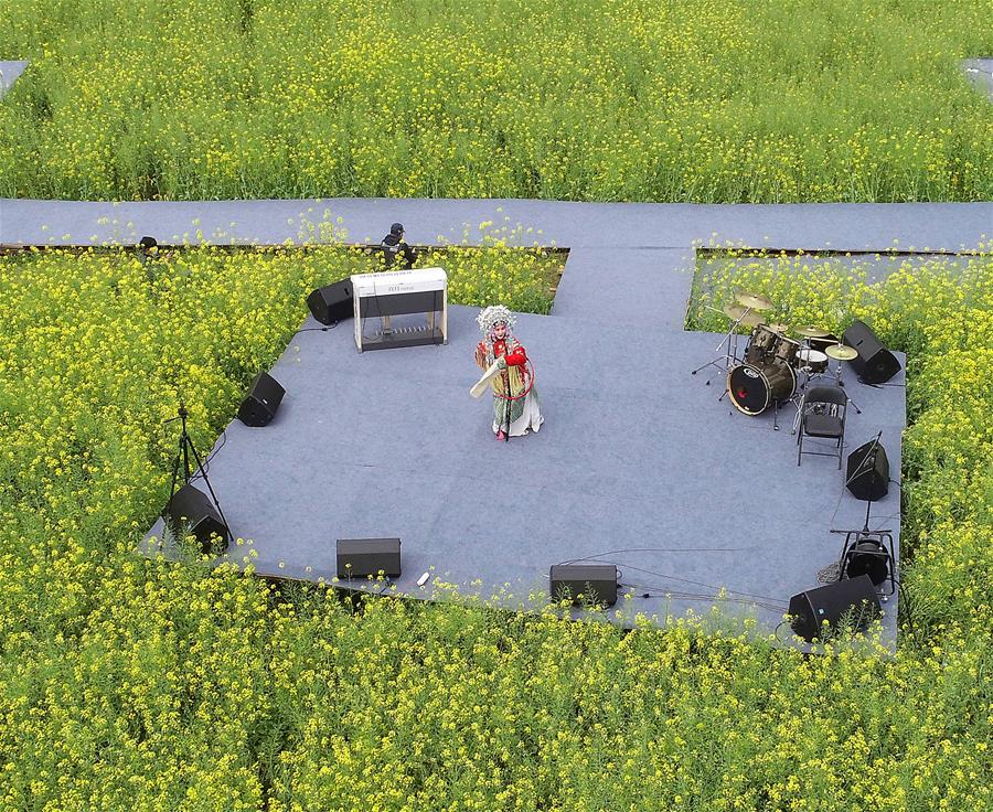 3月16日,演員在李坑村的“花田音樂會(huì)”上表演戲曲(無(wú)人機(jī)照片)。 新華社記者 萬(wàn)象 攝