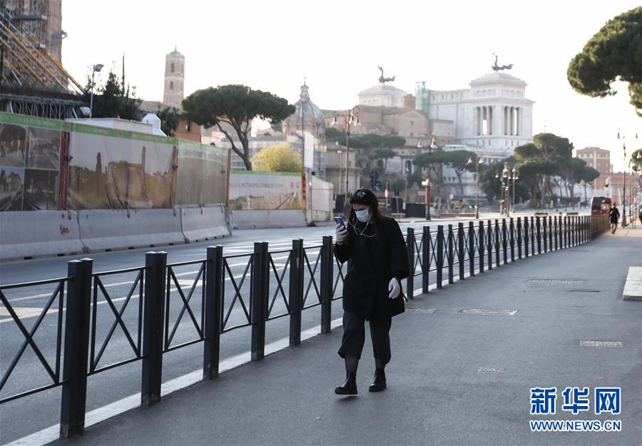 3月16日,在意大利首都羅馬,一名女子戴著口罩出行。新華社記者程婷婷攝