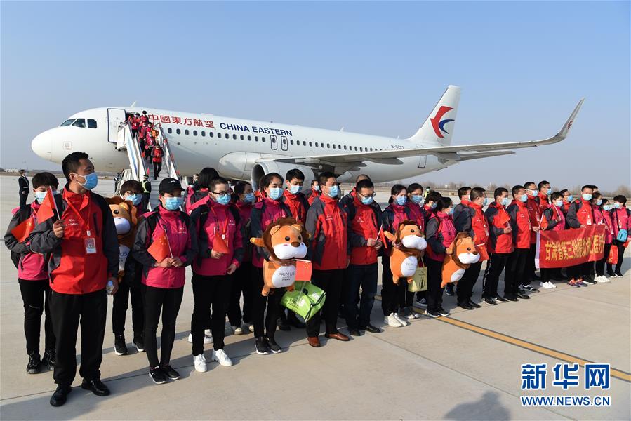 3月17日,醫(yī)療隊(duì)隊(duì)員抵達(dá)甘肅蘭州中川國際機(jī)場。新華社記者范培珅攝