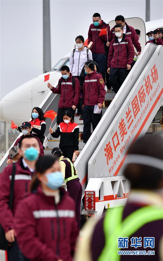 3月17日,醫(yī)療隊隊員抵達(dá)海南??诿捞m國際機(jī)場。新華社記者郭程攝