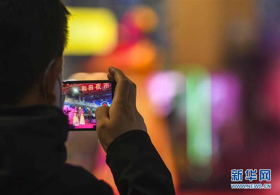 3月16日,在和田夜市環(huán)湖店,食客用手機(jī)拍攝夜市上的舞蹈節(jié)目。新華社記者 趙戈 攝