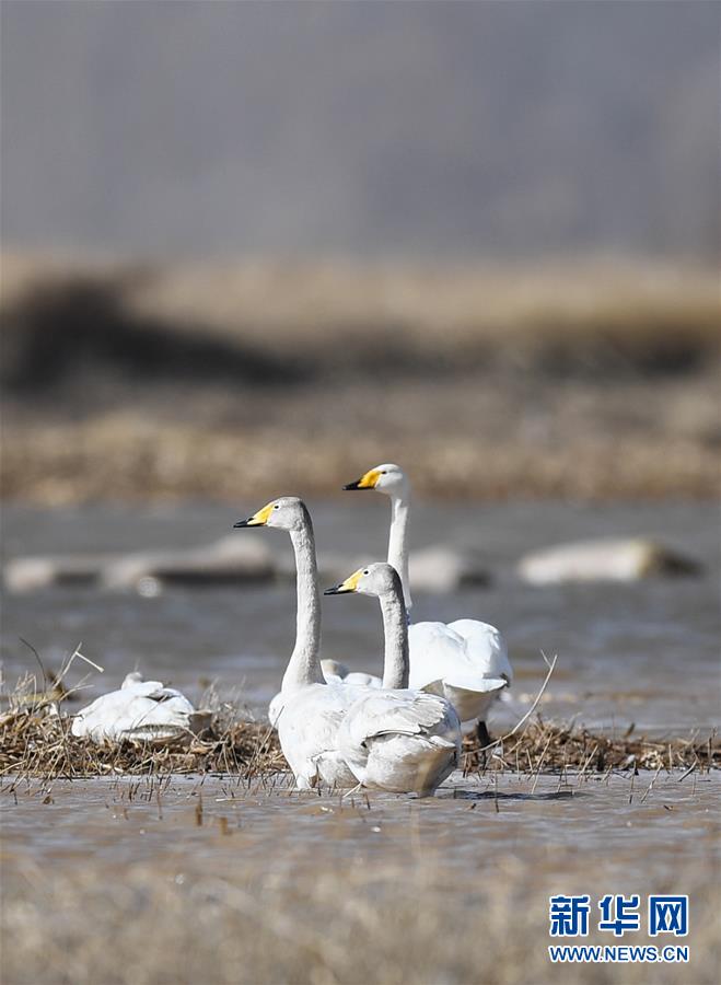 3月18日,候鳥在準格爾旗大路鎮(zhèn)的黃河淺灘上棲息。 新華社記者 劉磊 攝