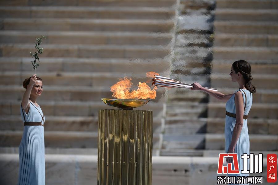 3月19日,扮演最高女祭司的希臘女演員桑西·喬治烏(右)從圣火盆中點燃火炬。