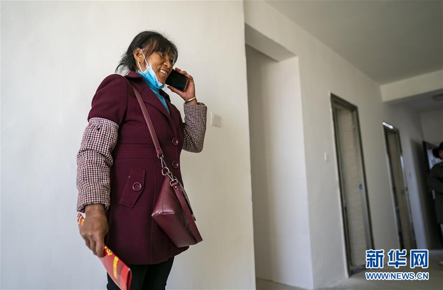 第一次進到新家的王大香給親戚們打電話報喜(3月15日攝)。 新華社記者 江文耀 攝