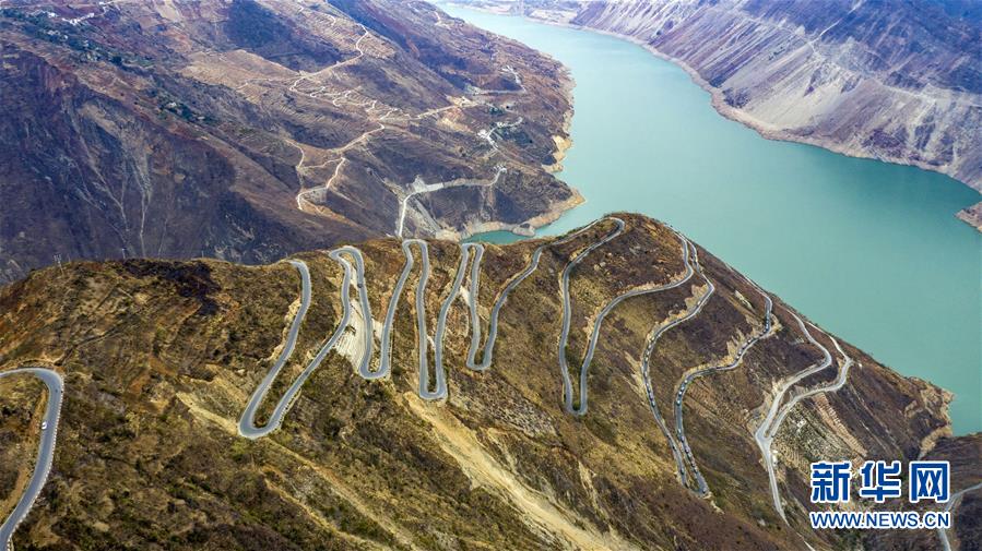 搬家的車隊行駛在金沙江畔的盤山公路上,江對岸是四川省金陽縣(3月15日攝)。 新華社記者 江文耀 攝