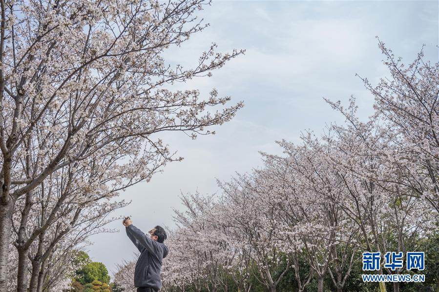 3月19日,在武漢市武昌區(qū)被網(wǎng)友稱為“武漢最美停車場”的湖北日報停車場,一名工作人員在拍攝櫻花。 新華社記者 才揚(yáng) 攝