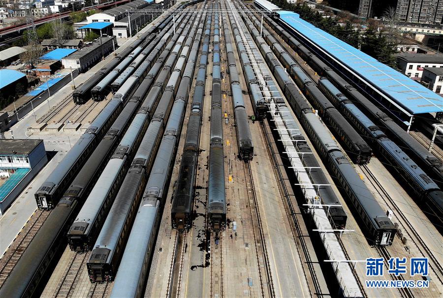 這是3月19日在鄭州車輛段鄭州客車整備所拍攝的準(zhǔn)備進(jìn)行春季整修的客車車體(無人機(jī)照片)。