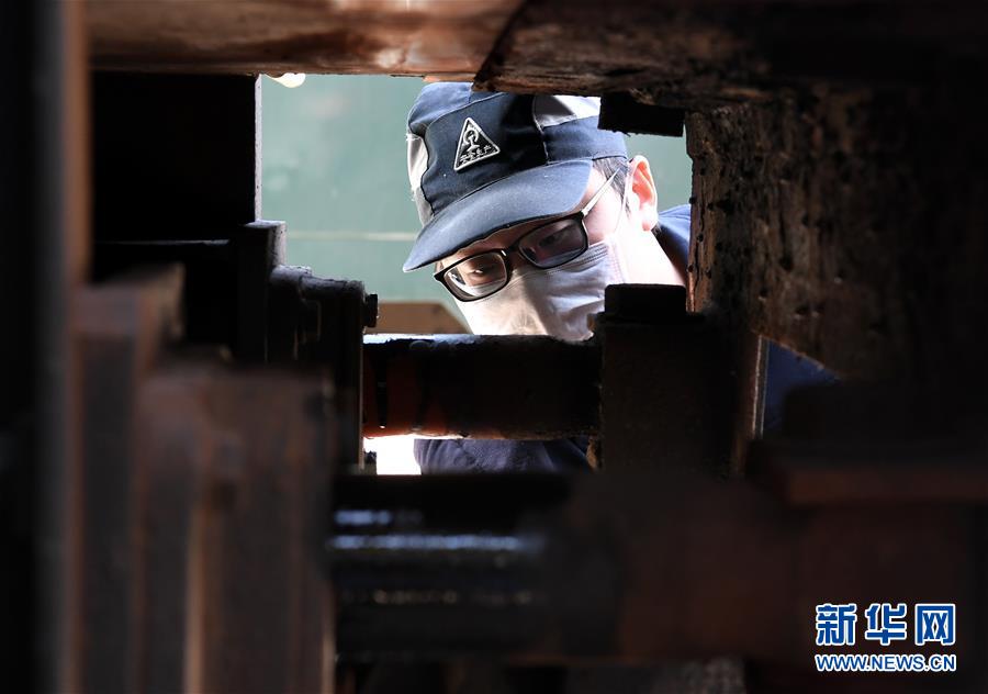 3月19日,鄭州車輛段客車檢車員在檢查客車車鉤鉤身。新華社記者 李安 攝