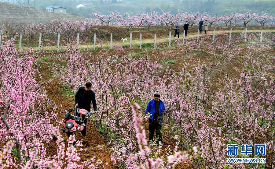 3月22日,龍亭鎮(zhèn)柳山村村民(前)在桃園中春耕。陽(yáng)春三月,陜西省漢中市洋縣龍亭鎮(zhèn)柳山村,1300畝桃園的花朵綻放。新華社記者陶明攝