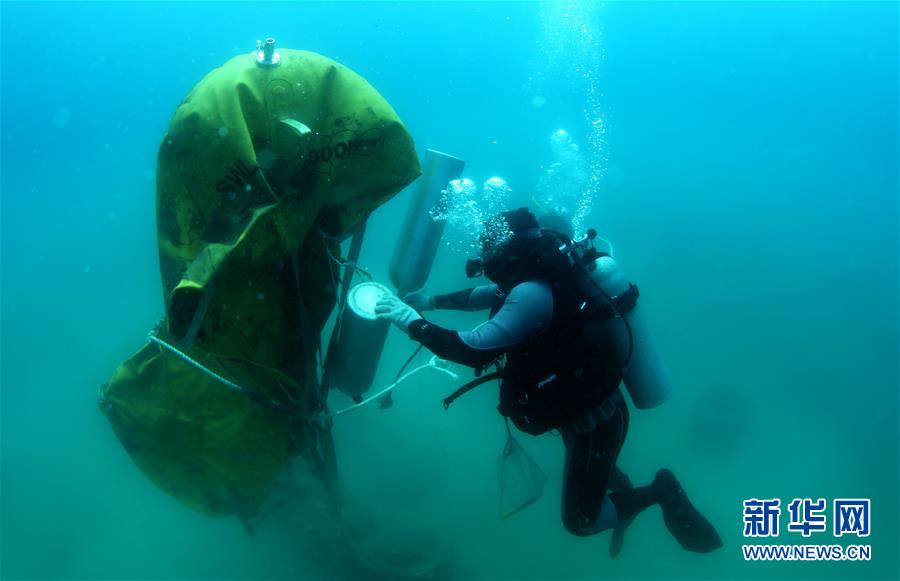 在位于海南三亞蜈支洲島旅游區(qū)的海洋牧場,工作人員在為浮力袋充氣后,浮力袋帶著固定好的人工魚礁上?。?月27日攝)。近日,位于海南三亞蜈支洲島旅游區(qū)的海洋牧場復工,海底作業(yè)逐漸恢復正常,開始進行人工魚礁吊裝擺位、水下監(jiān)控清理以及日常巡護等工作。據(jù)介紹,人工魚礁有利于魚類種類增加和數(shù)量提高,蜈支洲島海域海洋牧場人工魚礁表面附著珊瑚、貝類、藻類等生物種類達120余種。新華社記者楊冠宇攝