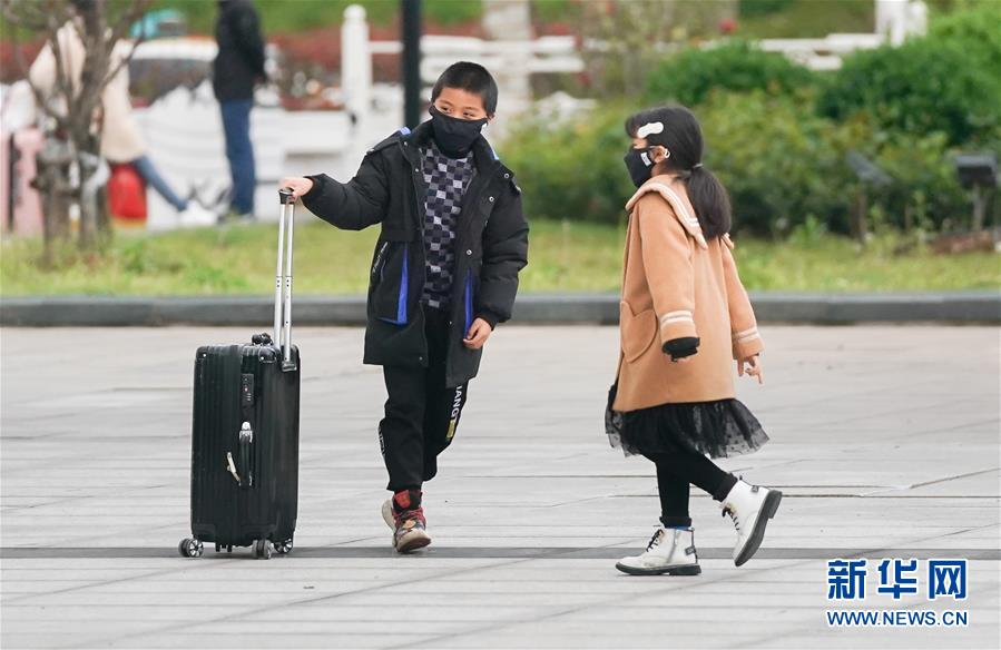 3月28日,兩名抵漢的小旅客在武漢站廣場(chǎng)上。新華社記者程敏攝
