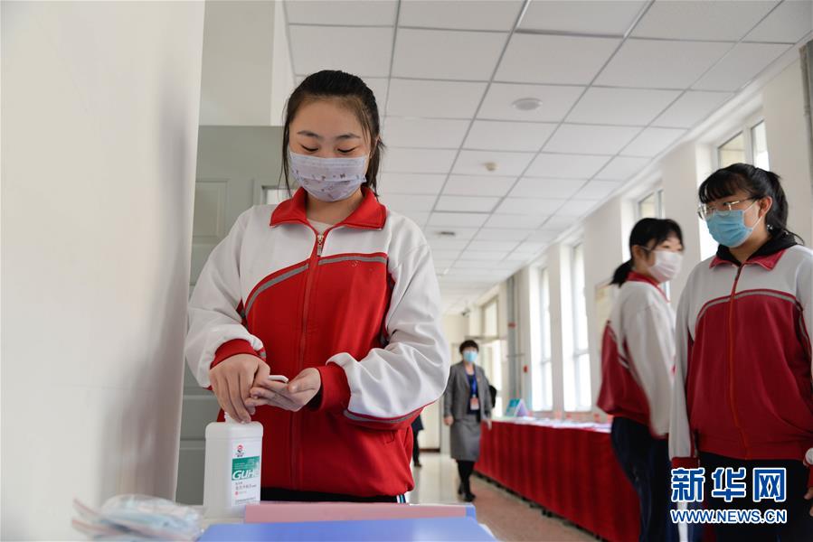 3月30日,學(xué)生在呼和浩特市第六中學(xué)教室外的走廊上使用免洗洗手液。當(dāng)日,內(nèi)蒙古自治區(qū)全區(qū)高三和初三年級(jí)開(kāi)學(xué)復(fù)課。新華社記者徐欽攝