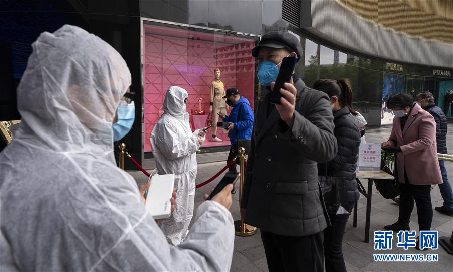 3月30日,在武商國際廣場的超市門口,顧客向工作人員出示健康碼。當日,武漢市多家商場開門迎客。新華社記者費茂華攝