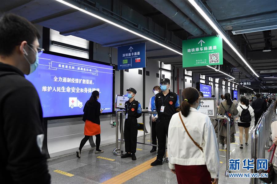 3月18日晚高峰時段,在深圳地鐵車公廟站,乘客掃描二維碼進行實名登記。新華社記者梁旭攝