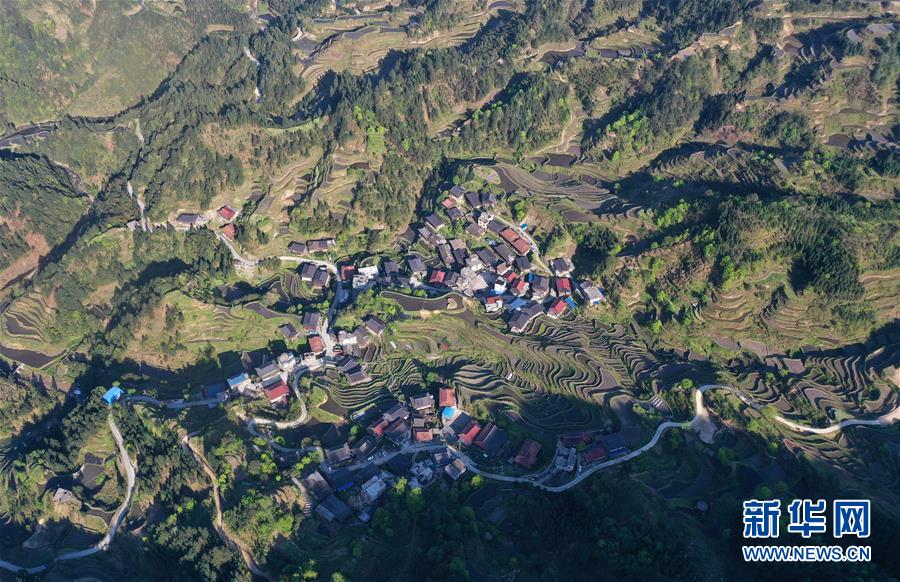 這是融水苗族自治縣桿洞鄉(xiāng)小河村高羽苗寨的木樓和梯田(3月31日攝,無(wú)人機(jī)照片)。隨著氣溫逐漸轉(zhuǎn)暖,廣西融水苗族自治縣桿洞鄉(xiāng)的苗寨梯田景色迷人,美如畫(huà)卷。新華社記者黃孝邦攝