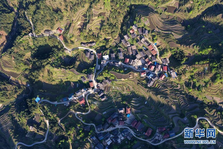 這是融水苗族自治縣桿洞鄉(xiāng)小河村高羽苗寨的木樓和梯田(3月31日攝,無(wú)人機(jī)照片)。新華社記者黃孝邦攝