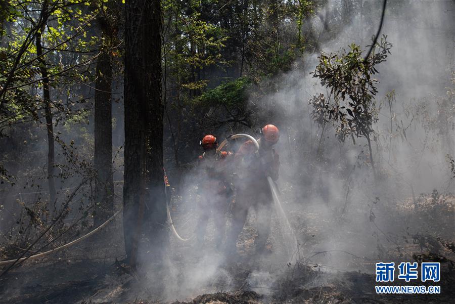 4月1日,四川省森林消防總隊隊員用水撲滅余火和煙點。新華社記者江宏景攝