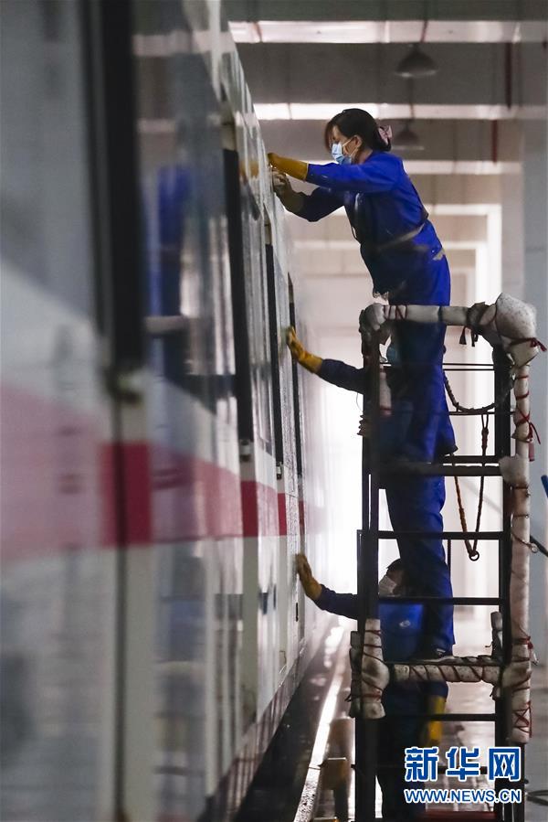 3月23日,在武漢地鐵常青車輛段,保潔人員在為地鐵列車消毒。新華社記者肖藝九攝