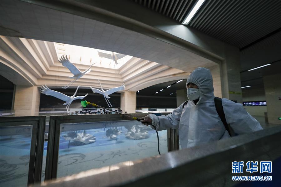 3月23日,在漢口火車站地鐵站,保潔人員在為站廳乘客通道消毒。目前,武漢城市功能和市民生活正逐步有序恢復,地鐵、公交車系統(tǒng)已啟動全面消殺和張貼乘客健康二維碼識別等舉措,為恢復運營做準備。新華社記者沈伯韓攝