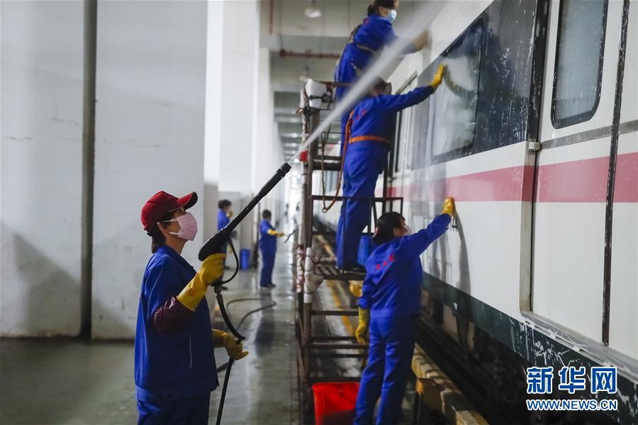 3月23日,在武漢地鐵常青車輛段,保潔人員清洗地鐵列車。新華社記者沈伯韓攝