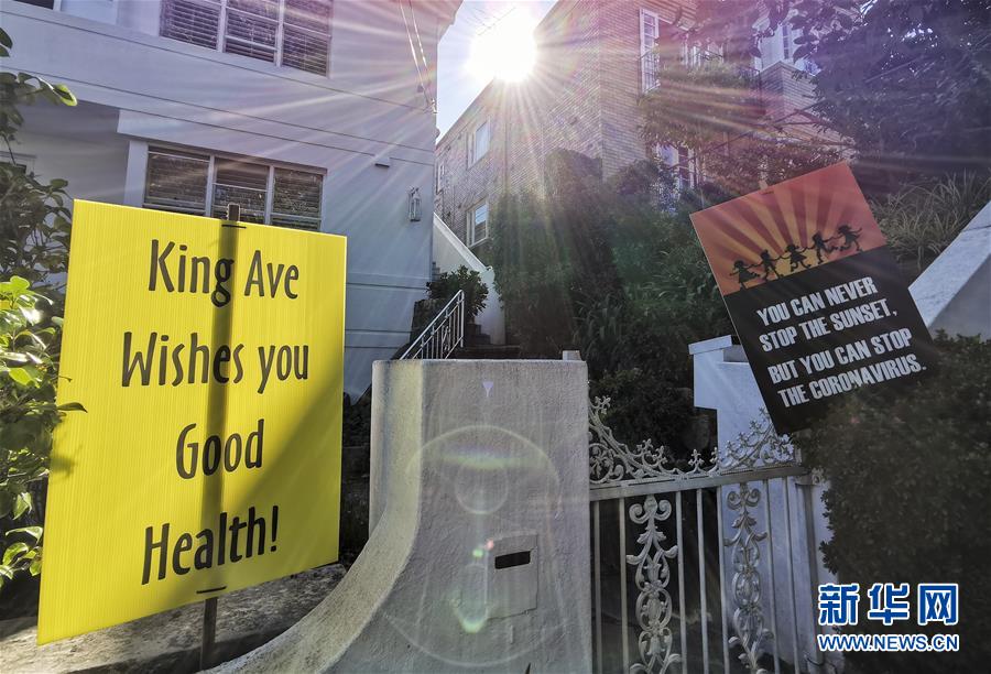這是4月4日在澳大利亞悉尼費(fèi)爾萊特社區(qū)拍攝的鼓勵(lì)人們樂觀抗疫的標(biāo)語牌。新華社記者白雪飛攝
