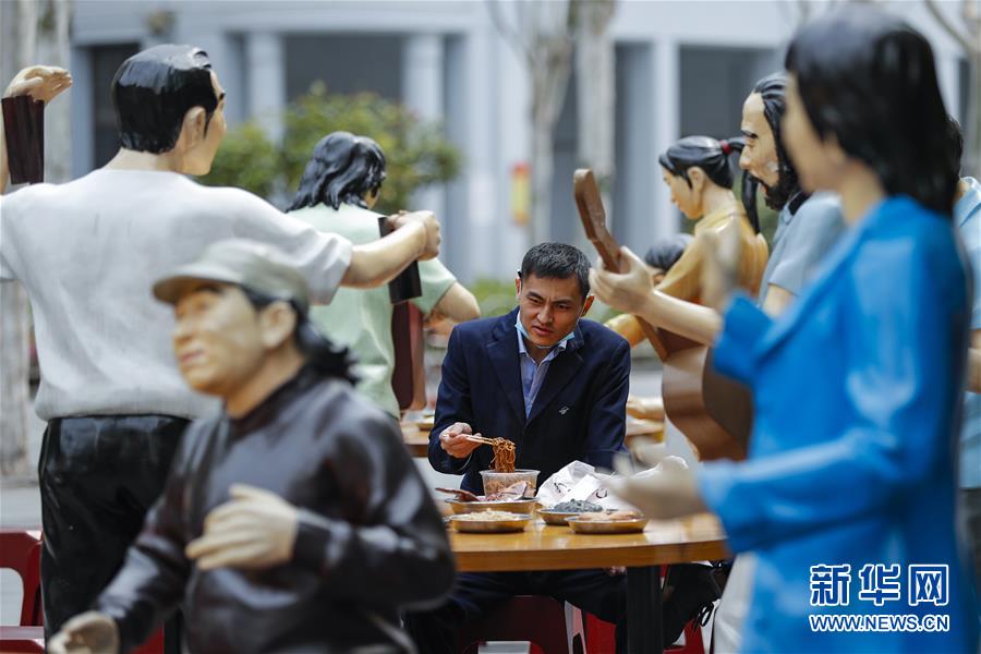 4月5日,市民在武漢市吉慶街的“大排檔”雕塑旁吃熱干面。